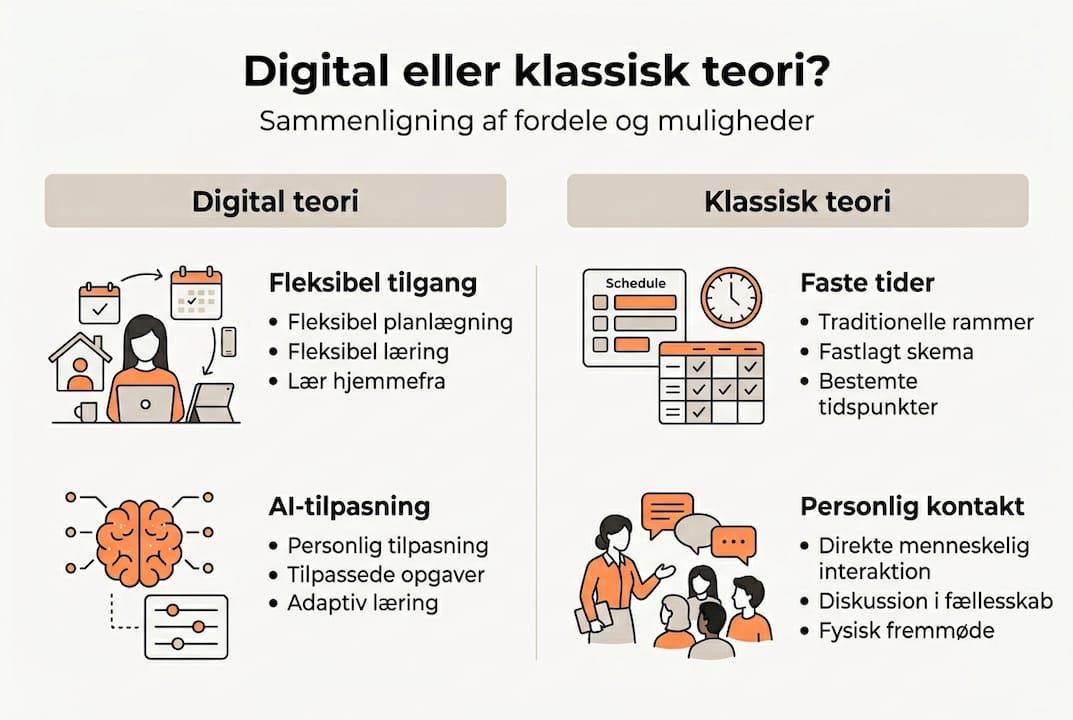 - Digital teoriundervisning giver fleksibilitet og høj beståelsesrate gennem online platforme.